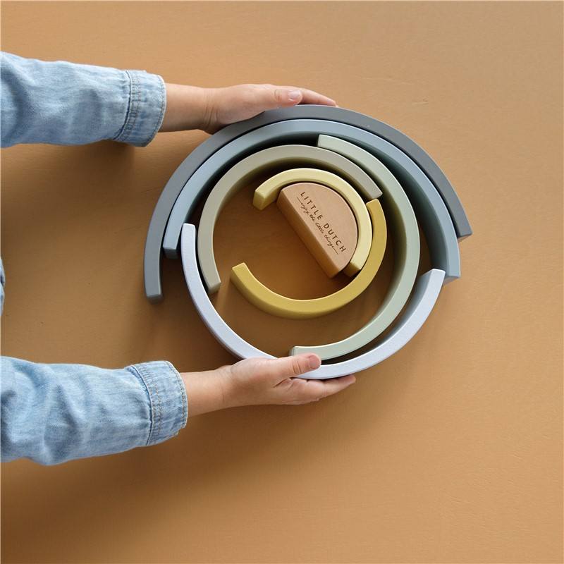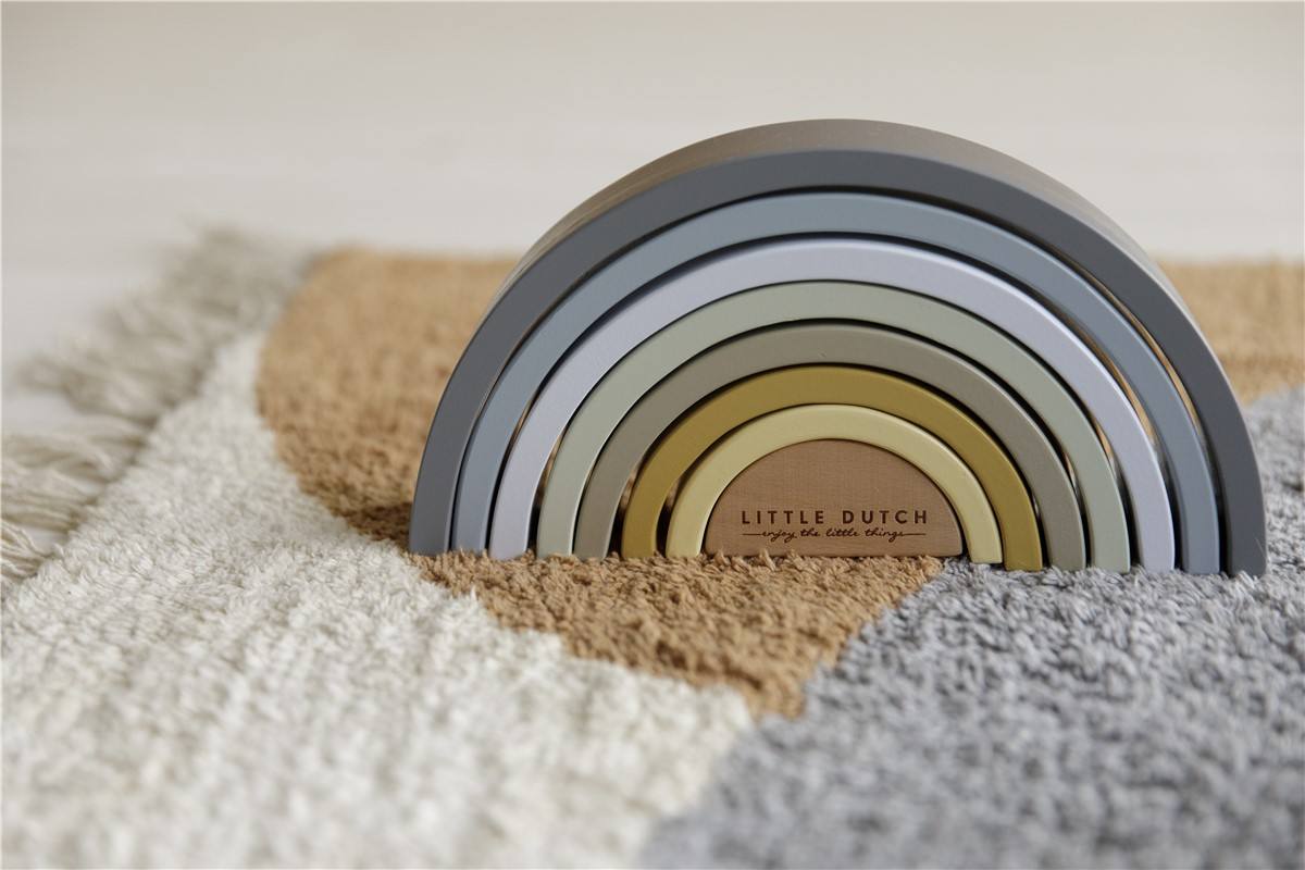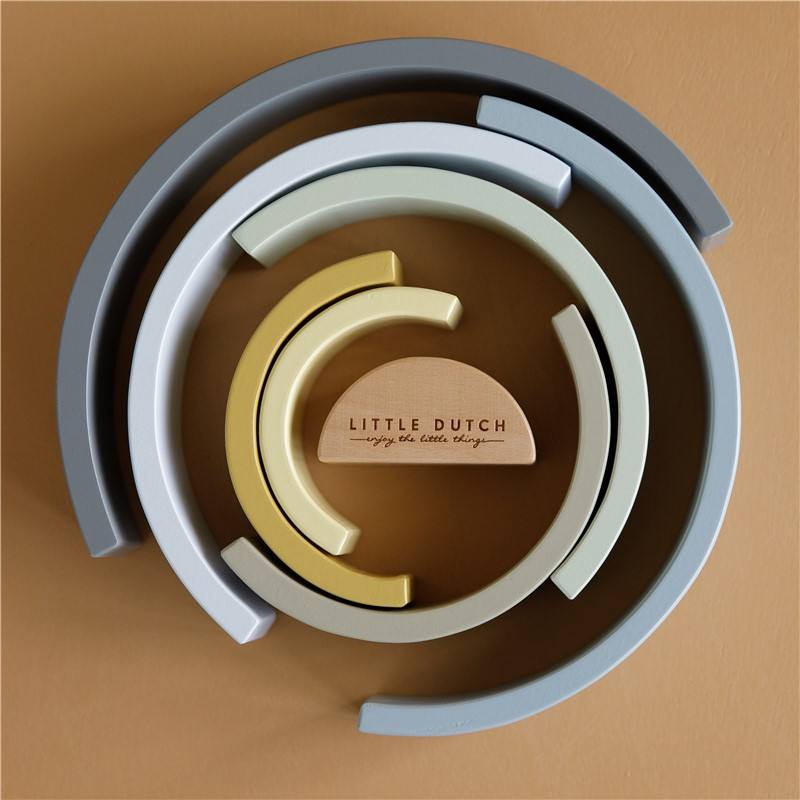 El arco iris de madera de Little Dutch es una torre de madera con forma de hermoso arco iris. El arco iris se ve muy bien en la habitación de un niño y es divertido jugar con él. Consta de 7 arcos que encajan entre sí. Su hijo puede usar estas formas semicirculares para jugar y aprender y para hacer todo tipo de creaciones utilizando su imaginación. Los arcos también se pueden utilizar como un túnel de tren, una casa para muñecas o montañas para coches pequeños.