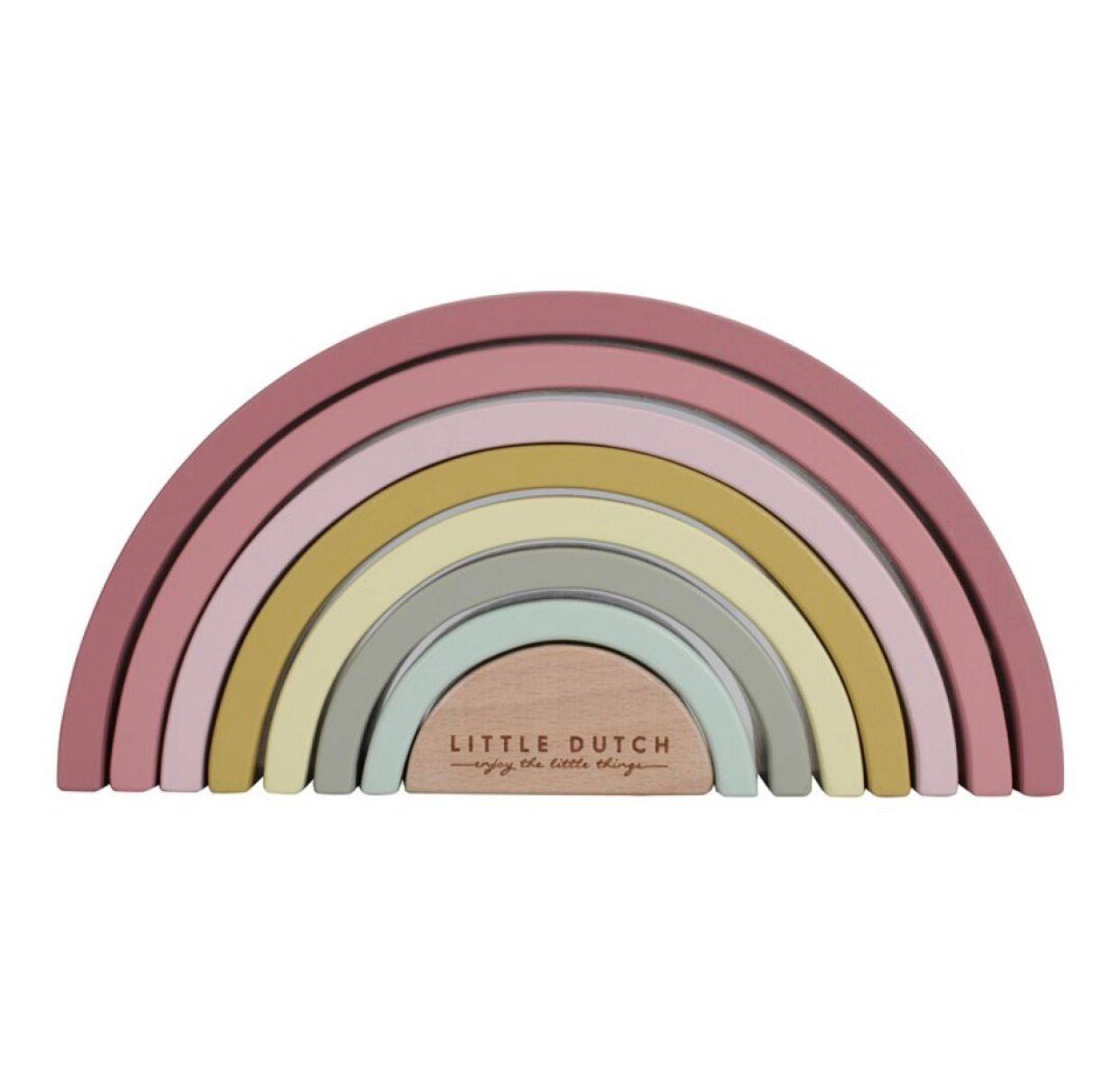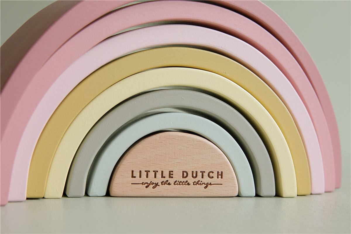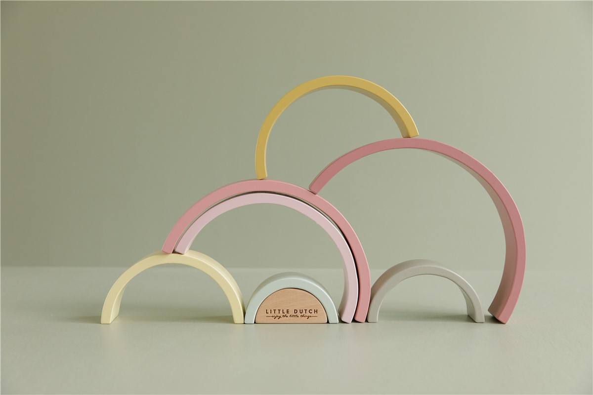 El arco iris de madera de LIttle Dutch es una torre de madera con forma de hermoso arco iris. El arco iris se ve muy bien en la habitación de un niño y es divertido jugar con él. Consta de 7 arcos que encajan entre sí. Su hijo puede usar estas formas semicirculares para jugar y aprender y para hacer todo tipo de creaciones utilizando su imaginación. Los arcos también se pueden utilizar como un túnel de tren, una casa para muñecas o montañas para coches pequeños.