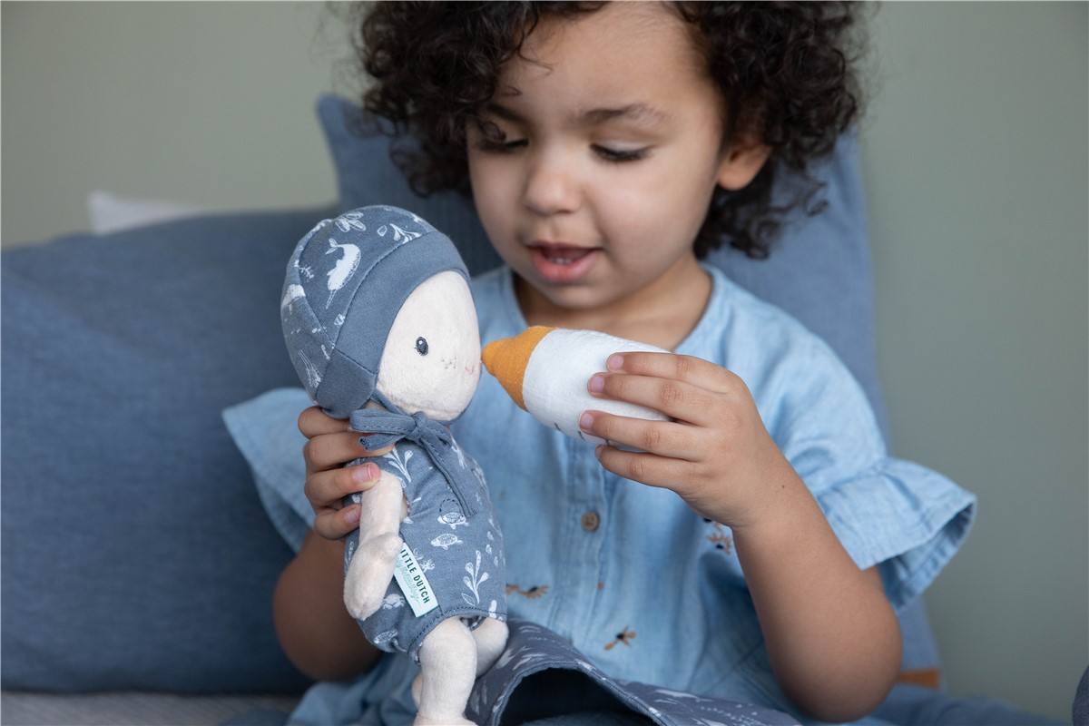 Conoce al pequeño bebé Jim. Este dulce muñeco de peluche quiere que lo abracen y lo lleven a todas partes. Baby Jim se hará amigo de cada niña o niño: pueden alimentarlo con el biberón o calmarlo con el chupete, pueden cambiarle el pañal, ponerle el