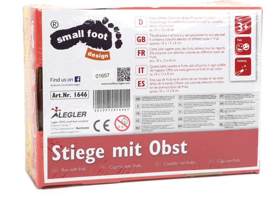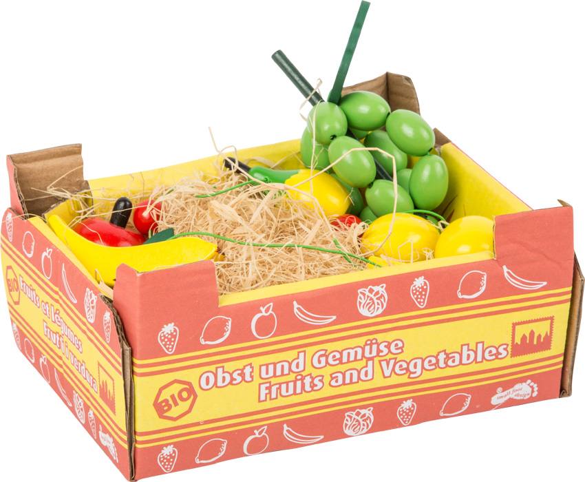 Esta caja de cartón estable contiene 11 piezas de madera barnizada colorida en un nido de hierba artificial. Un accesorio muy guay para juegos realistas en la tienda infantil. Adecuados para el puesto de ventas.