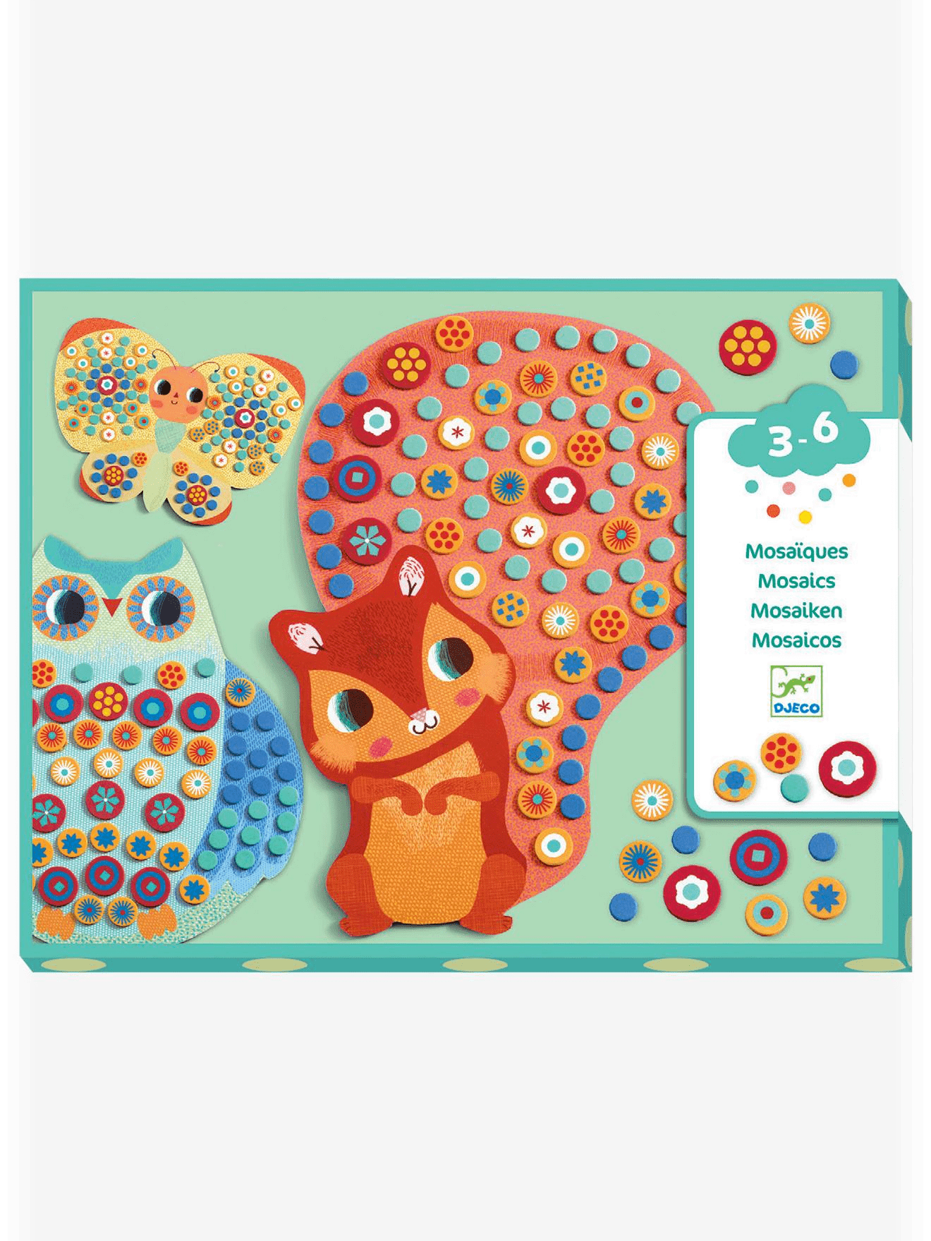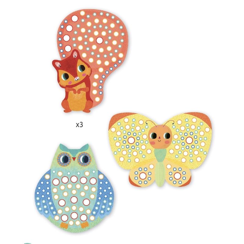 Collage Djeco para los más pequeños. Para decorar 3 preciosos cuadros en forma de mariposa, buho y ardilla con gomaeva adhesiva. Se sentirán orgullosos de su trabajo y seguro que serán una simpática y original decoración para la casa o un regalo diferente para sus amiguitos o familiares.