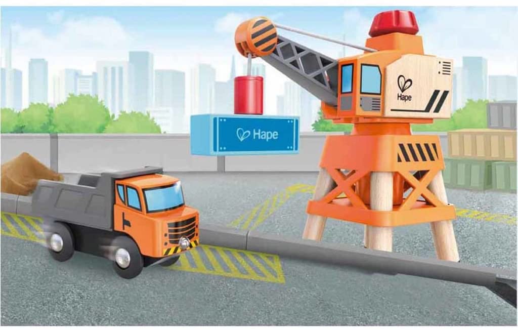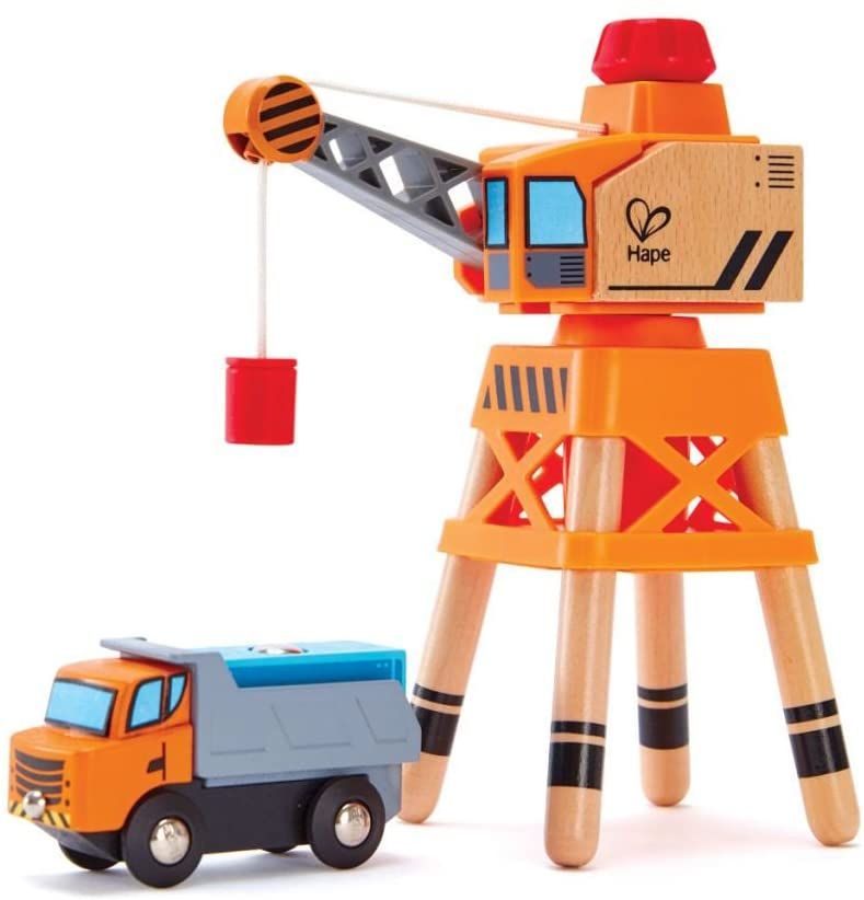 ¡Gira el botón de la grúa para hacer descender el montacargas magnético y recoger el cargamento! El brazo de la grúa puede girar 360 grados y hace un ruido de «clic» a medida que la giras. Las patas de la grúa son lo suficientemente anchas para que las vías y los trenes puedan pasar por debajo.