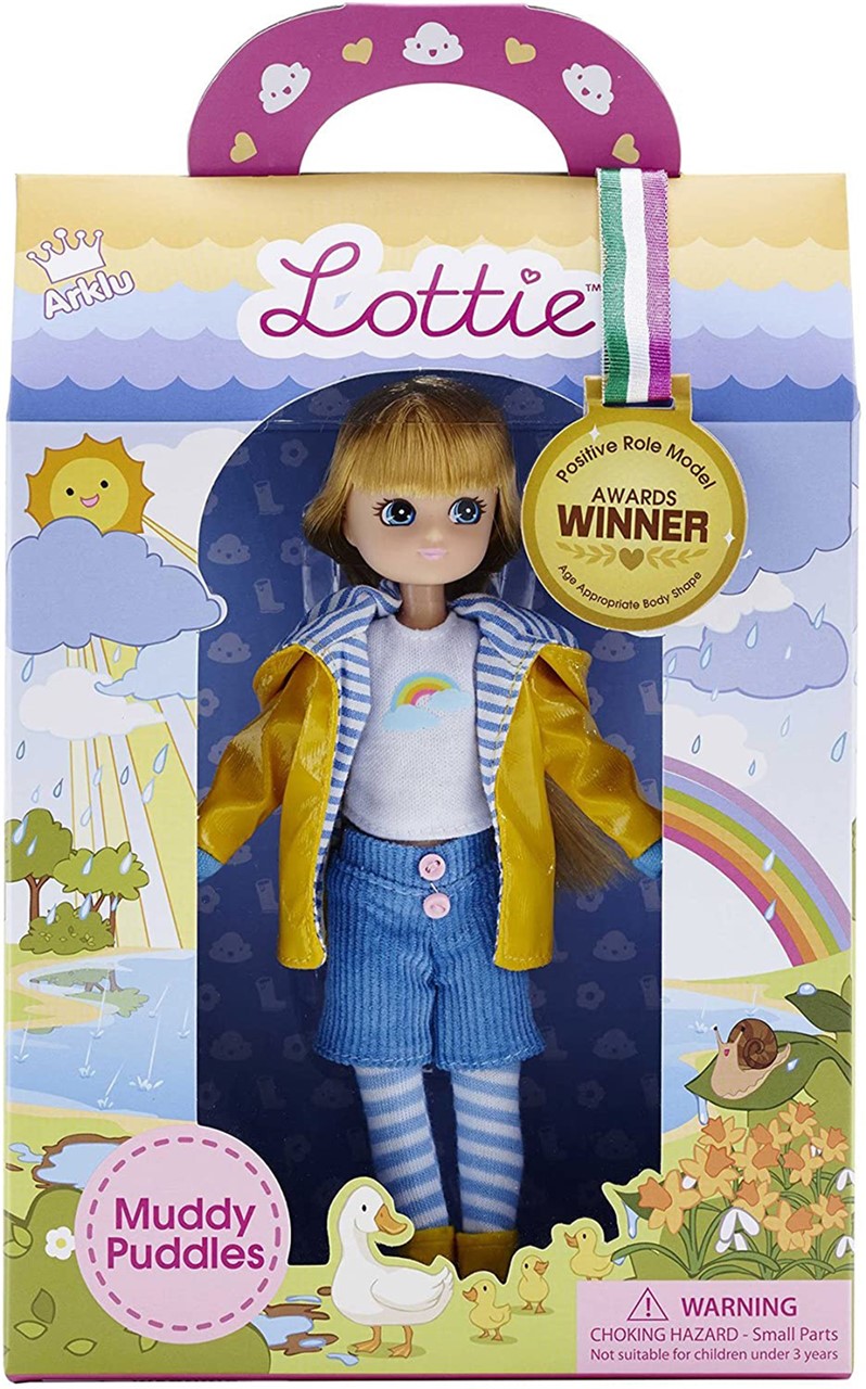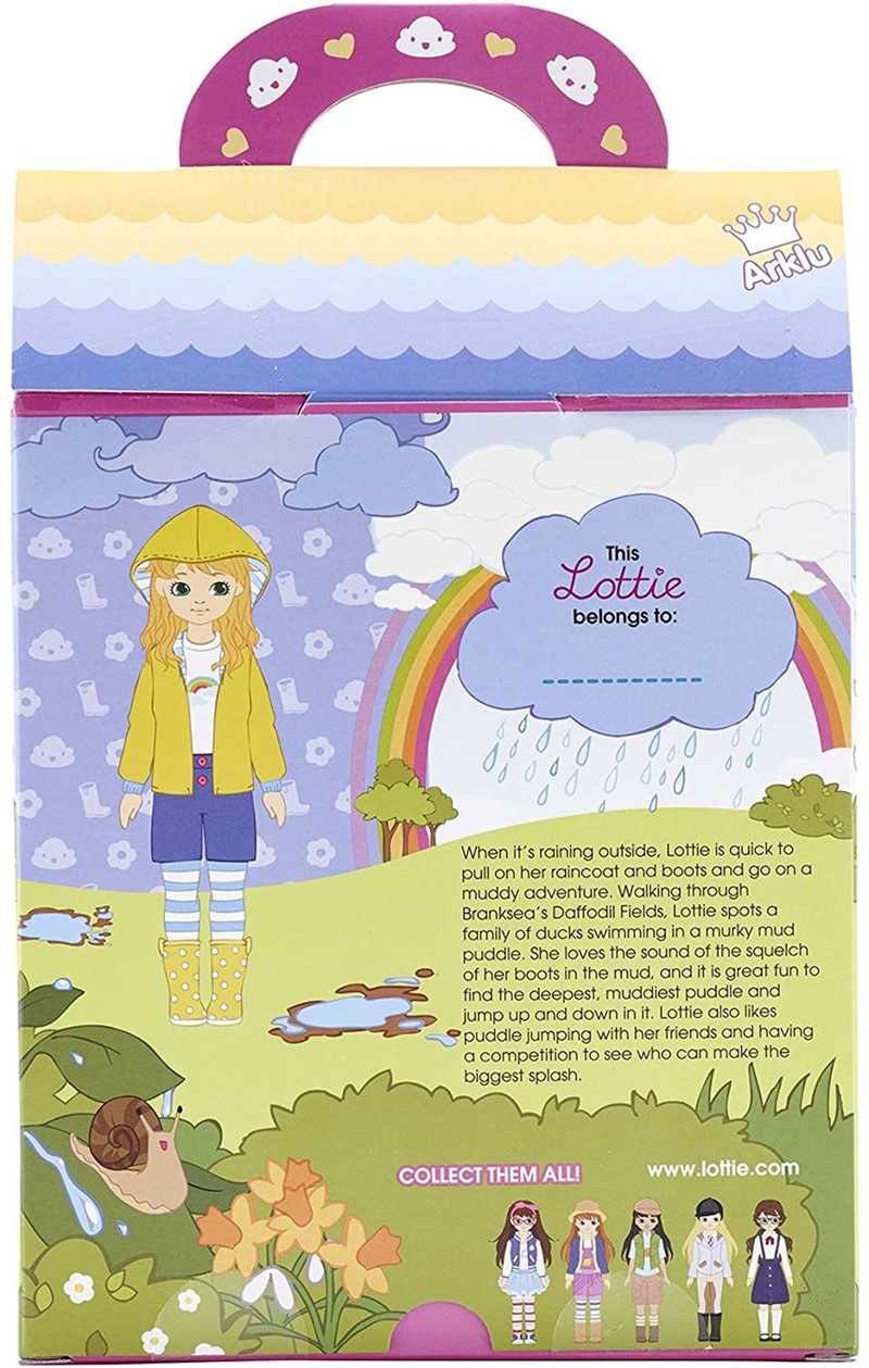 Cuando llueve, Lottie no tarda en coger su chubasquero y sus botas y emprender una aventura entre charcos y barro. Atravesando los campos mojados Lottie ve una familia de patos nadando en un charco con barro. Le encanta el ruido y la sensación de pisar los charcos, y disfruta buscando los charcos más profundos para saltar y jugar. A Lottie también le encanta hacer competiciones con sus amigos y amigas a ver quién salpica más en los charcos.