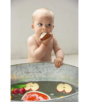 Este producto es perfecto como mordedor, juguete de bebés y niños, juguete para la hora del baño, como juguete para juego sensorial y objeto decorativo. Está hecho siguiendo un proceso artesanal y sostenible con caucho 100% natural extraído de los árboles Hevea. Cada uno se crea de una sola pieza, por lo que se evita la creación de bacterias en su interior. Pintados a mano uno a uno con pigmentos naturales, ¡no hay dos iguales!