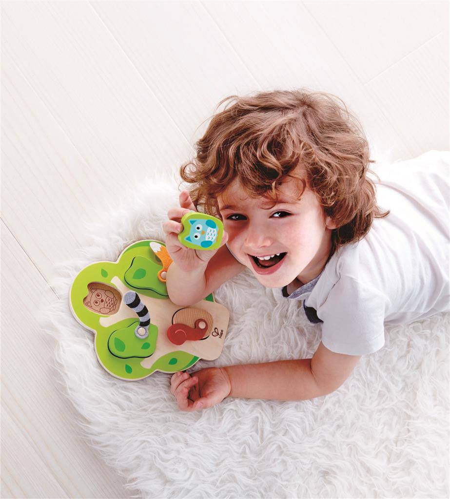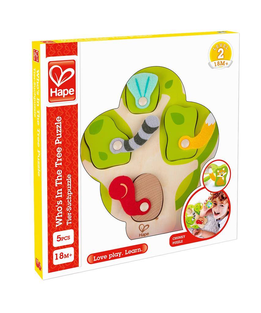 ¿Quién se esconde en el árbol? Descúbrelo tirando de las colas de tela de los animales. Bonito puzzle encajable con piezas de tela y madera. Edad Recomendada 18m+ Medidas 20.8 x 18.6 x 1.8 cm